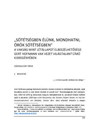 Zászkaliczky Réka: "Sötétségben élünk, mondhatni, örök sötétségben" - a vakság mint létállapot elbeszélhetősége Gert Hofmann Vak vezet világtalant című kisregényében. In: Szövegek között 25., (25). pp. 200-236. (2023)