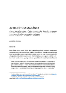 Borbíró Bíborka: Az objektum magánya - értelmezési lehetőségek Kollár Árpád Milyen madár című verseskötetében. In: Szövegek között 26., (26). pp. 361-397. (2024)