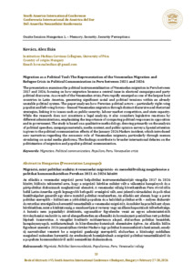 Kovács Alex Ilián: Migration as a political tool: the representation of the Venezuelan migration and refugee crisis in political communication in Peru between 2021 and 2026 = Migráció, mint politikai eszköz: a venezuelai migrációs- és menekültválság megjelenése a politikai kommunikációban Peruban 2021 és 2026 között : [absztrakt].