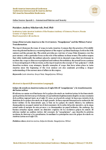 Piatakov Andrey Nikolaevich: Coups d'etat in Latin America in the 21st century. "Neogolpismo" and the military factor transformation = Golpes de estado en América Latina en el siglo XXI. El "neogolpismo" y la transformación del factor militar : [abstract].