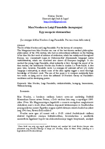 The lies of Max Nordau and Luigi Pirandello. For the history of a reception The Hungarian-born Max Nordau was one of the best-known medical philosopherphilosophers of the 19th century, who had an extraordinary influence on the thinking of his time. His first work of criticism of civilisation, which was widely read throughout Europe, was Conventionelle Lügen der Kulturmenschheit (Konvencionális hazugságok modern kultúréletünkben), which was translated into almost all European languages. It also reached the young Luigi Pirandello, albeit indirectly at first, through the report of his then teacher, the enthusiastic Nordau fan Professor Andrea Lo Forte-Randi. A few years later, however, Pirandello wrote La menzogna del sentimento nell'arte [Az érzelem hazugsága a művészetben], in which some of the ideas rightly suggest a more thorough knowledge of Nordau's work. The aim of this paper is to compare analytically these two works on lying and to show the influence of Nordau's theory on Pirandello's worldview and his developing poetics.